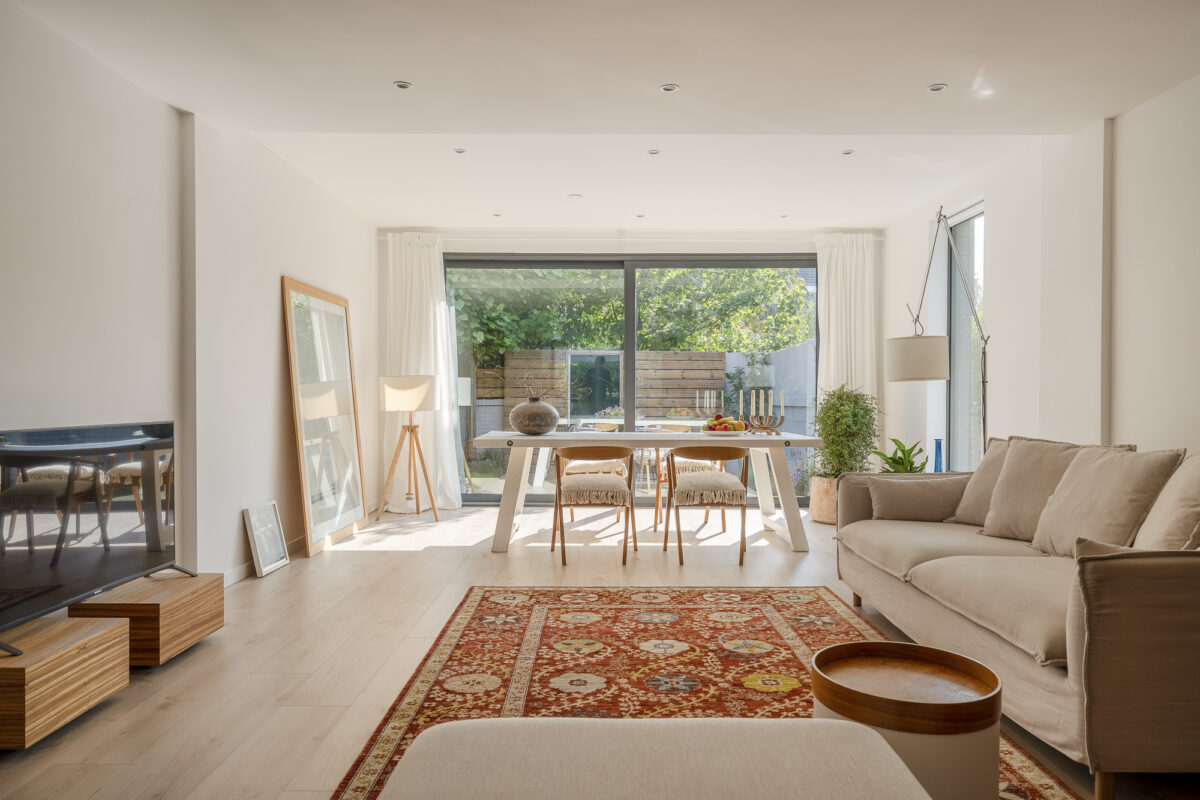 Ground floor: The ground floor, with underfloor heating, is a charming and inviting space: a spacious living room with abundant natural light, a cozy breakfast area, a modern kitchen with various built-in appliances (Siemens), a comfortable sitting area, and space for a large dining table for extended meals or drinks. The southwest-facing garden enjoys the sun from 1:00 PM until the end of the day. The garden also has rear access.