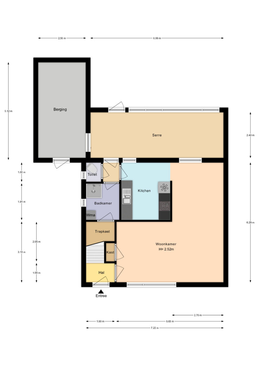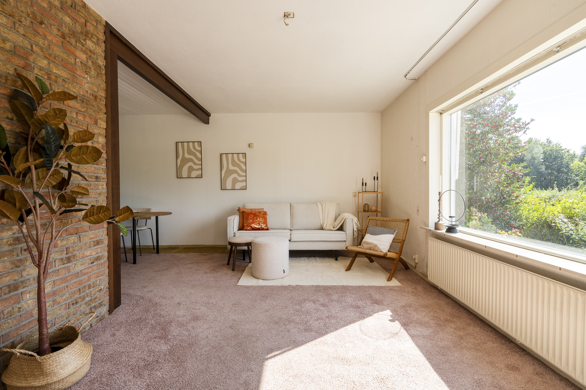 Keurig aangelegde voortuin met parkeren op eigen terrein, entree, hal, L-vormige woon-/eetkamer met meterkast en moderne half open keuken voorzien van inbouwapparatuur, hal, toilet, badkamer met douche en wasmachine droger aansluiting, aangebouwde en verwarmde serre (thans niet meegerekend bij de woonoppervlakte).