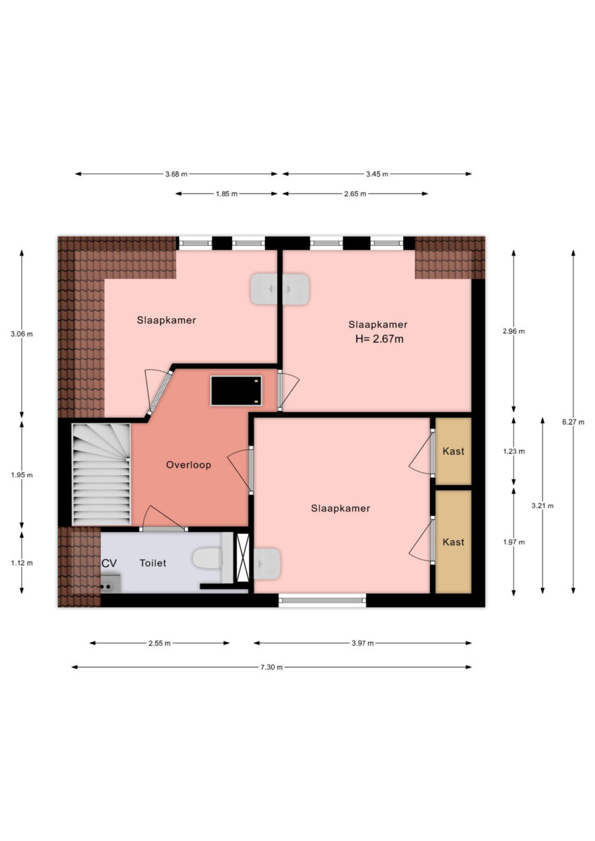 Overloop, toilet met CV-ketel opstelling, masterbedroom aan de voorzijde met 2 inbouwkasten, wastafel en uitzicht over de weilanden, achterzijslaapkamer met dakkapel, achterslaapkamer met dakkapel.
