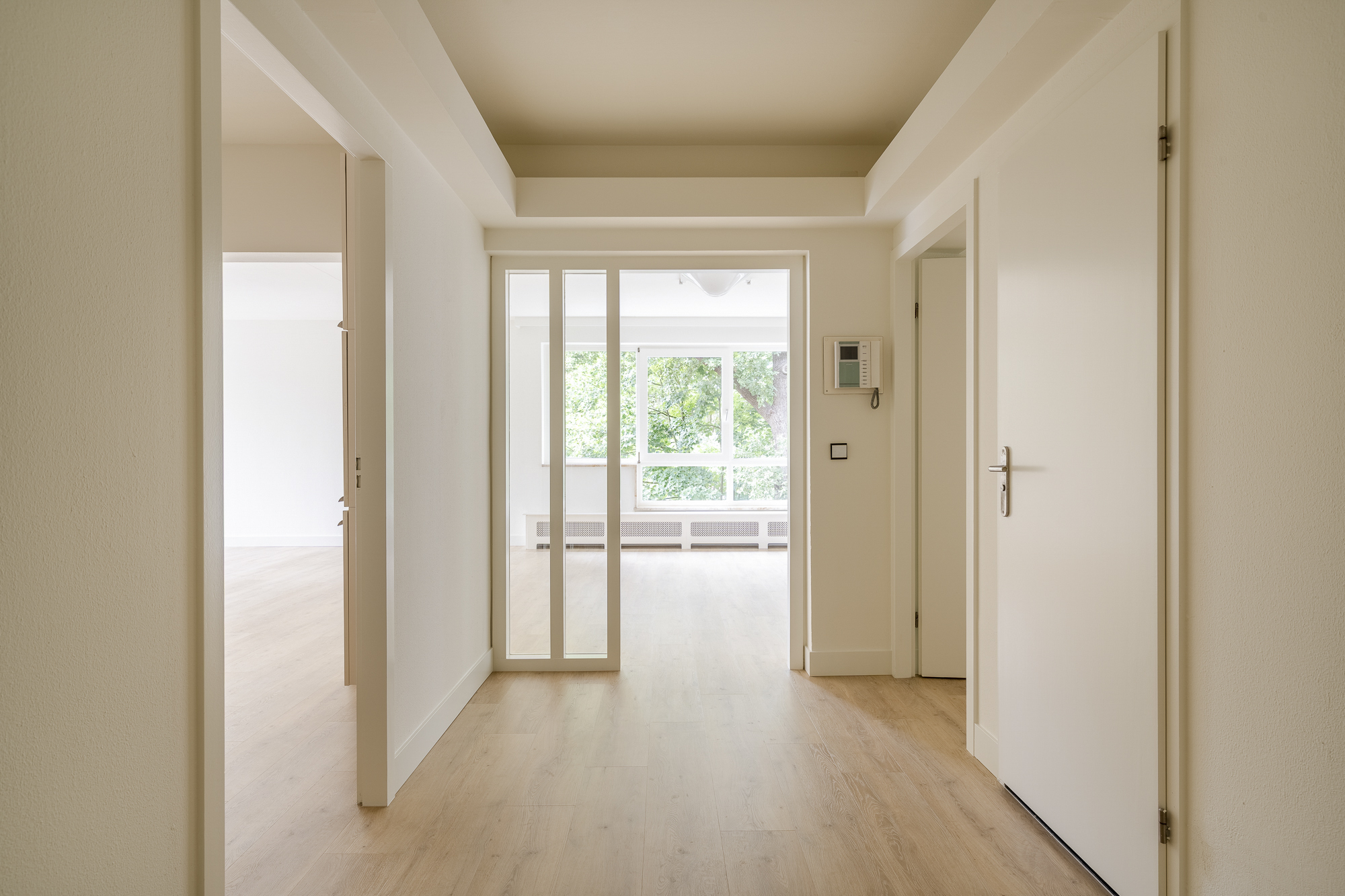 Via de gang bereikt u de aan de achterzijde gelegen ruime hoofdslaapkamer met directe toegang tot een eigen badkamer, uitgerust met een ligbad, inloopdouche, toilet en wastafelmeubel. De tweede slaapkamer – ook goed bruikbaar als werkkamer of logeerkamer – heeft een eigen balkon op het westen, waar de middag- en avondzon volop aanwezig is. Tegenover deze kamer ligt een tweede, compacte badkamer met douche en wastafel – ideaal voor gasten. In de kelder van het gebouw bevindt zich de bergruimte en de privé parkeerplaats.