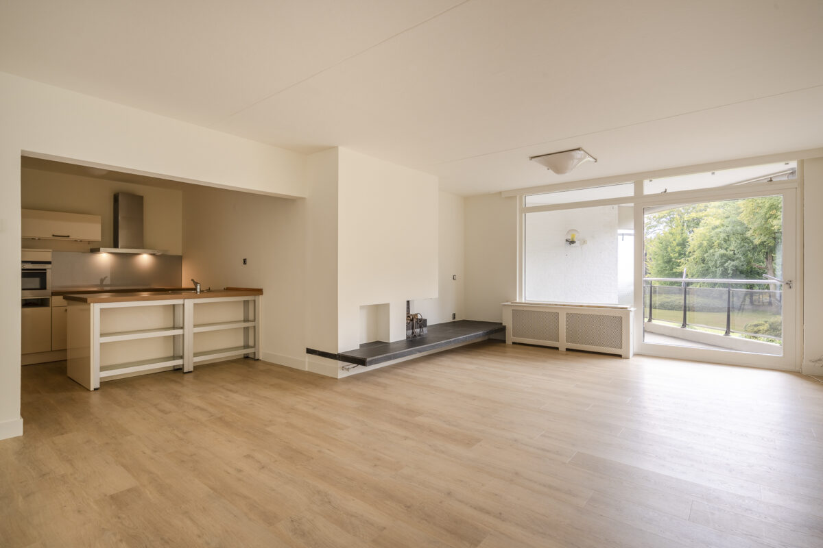 U komt binnen in een ruime hal met garderobe en loopt zo de zonnige, royale woonkamer in met gashaard en balkon op het zuiden. Hier geniet u vanaf het begin van de middag tot zonsondergang van de zon – zowel op het balkon als in de woonkamer. De halfopen keuken is zowel vanuit de woonkamer als de hal bereikbaar. In de hal is tevens een separaat toilet met fonteintje aanwezig en een berging met opstelplaats voor de cv-ketel en aansluiting voor de wasmachine en droger.