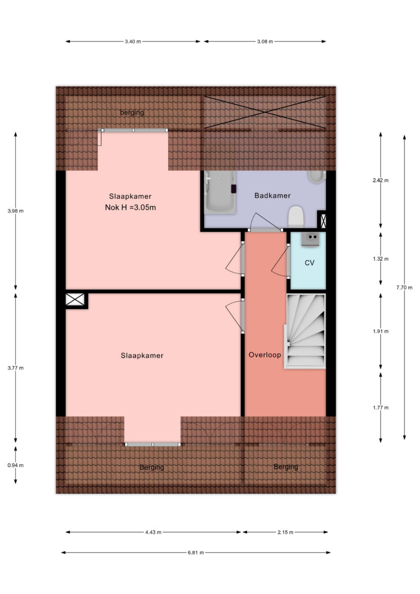 Aan de achterzijde ligt de vierde slaapkamer met dakkapel en bergruimte achter de knieschotten. De vijfde slaapkamer aan de voorzijde beschikt eveneens over een dakkapel en knieschotberging.
