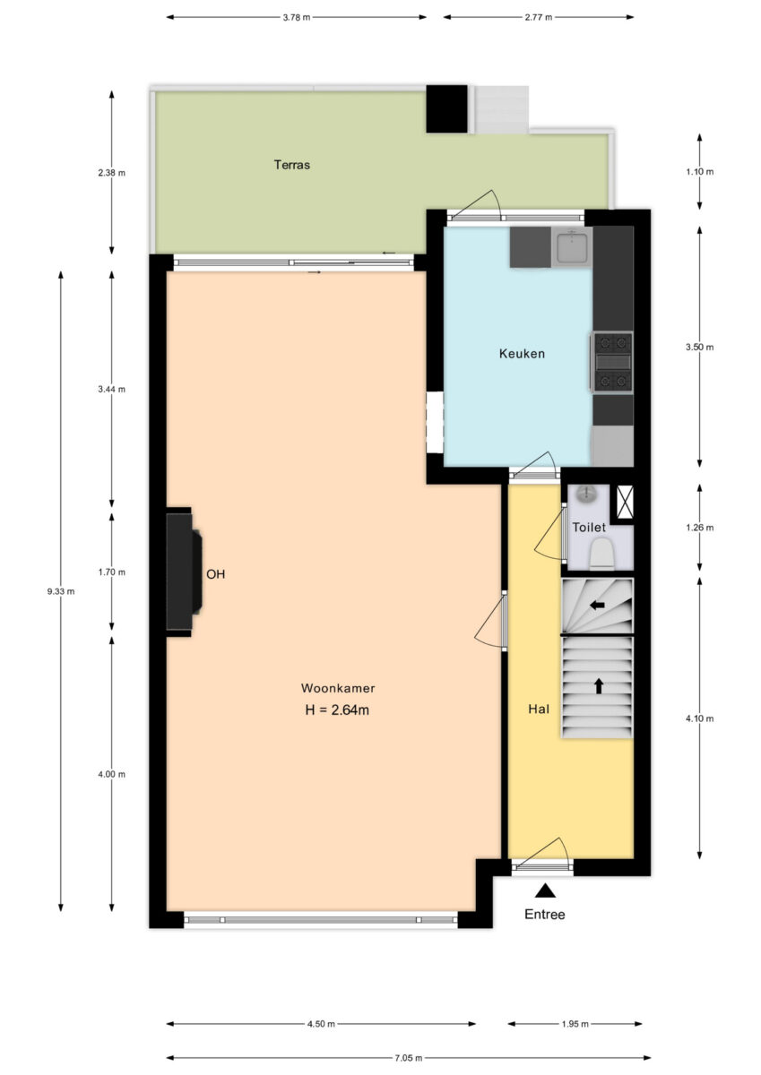 Begane grond: via een trappetje bereik je de voordeur. De entree biedt toegang tot de gang met een nette toiletruimte voorzien van fonteintje. De zeer lichte woonkamer heeft een sfeervolle uitstraling dankzij de grote raampartijen aan de voorzijde, een laminaatvloer en een karakteristieke schouw met open haard.